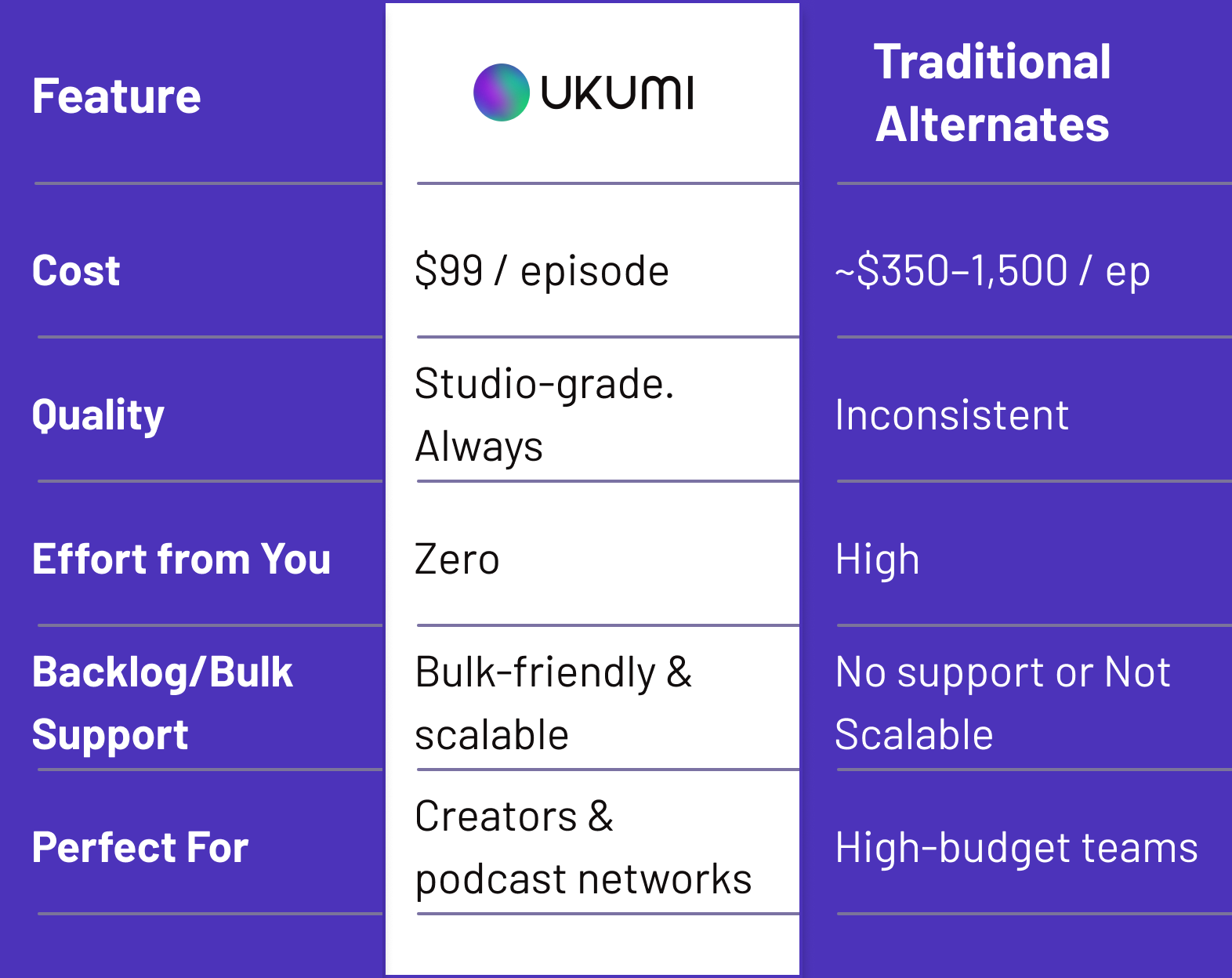 | Cost | ~$350-1,500 / ep | $20-50/month + your time. Subscription. | $99 / episode |